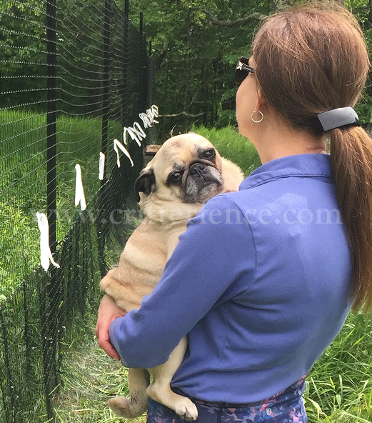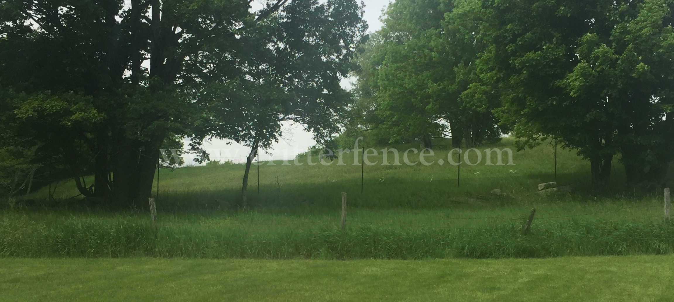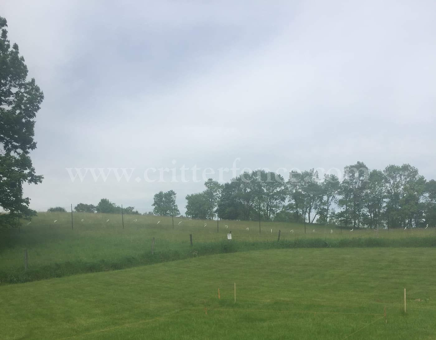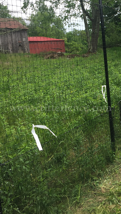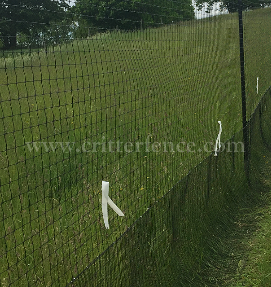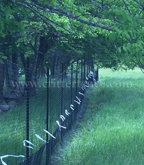 This customer needed a fence to keep animals out and her dog in. Pictured is a deer & wildlife exclusion fence consisting of Critterfence 800 poly fence mesh paired with a 1/2"x1/2" Critterfence Steel Grid base. The fence material is suspended from our standard posts and 12ga black braided steel cable at the top and where the poly fencing meets the bottom wire.