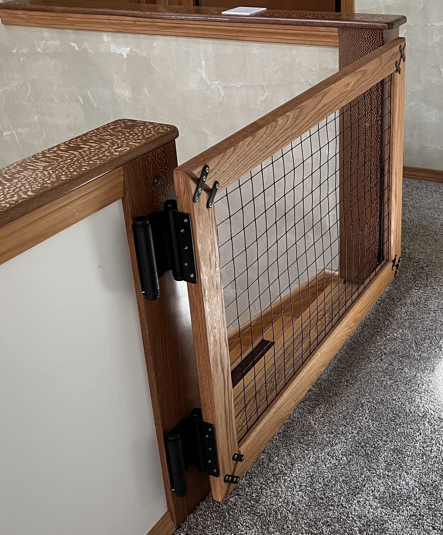 Chris from NY used one roll of our fence 5x100 2x2 Black Steel Grid for several different projects around his house,All pics are 5’ 2x2 steel critter fence, from one roll. "First pic is cedar outdoor stairs, second pic is a portable adjustable dog pen with junk pine wood from pallets at 64 total feet, and the last pic is a double swing oak dog gate. The critter fence irreplaceable to work with."