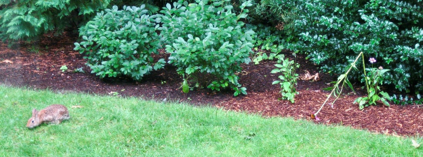 "Here’s a success story involving a novel use of Critterfence Black Steel 1 inch Square Grid. Winter in New England is bleak, so we’ve planted many evergreen shrubs in our garden, such as Holly, Rhododendron, and Mountain Laurel. To add color in Summer, we’ve added tall, perennial, flowering plants such as Echinacea (a.k.a. Coneflower) and Black Eyed Susan. Rabbits love these flowering plants. They eat the flowers first, and then the green leaves . The flowers grow on stalks 2 ft to 3 ft tall, which is higher than a rabbit can reach, so a rabbit bites through the stalk where he can reach; the stalk breaks at this point and the flower falls to the ground. (Smart, huh?) I photographed this rabbit (acting guilty, slinking away on the left) just a few seconds after he'd felled the Echinacea flower on the right: