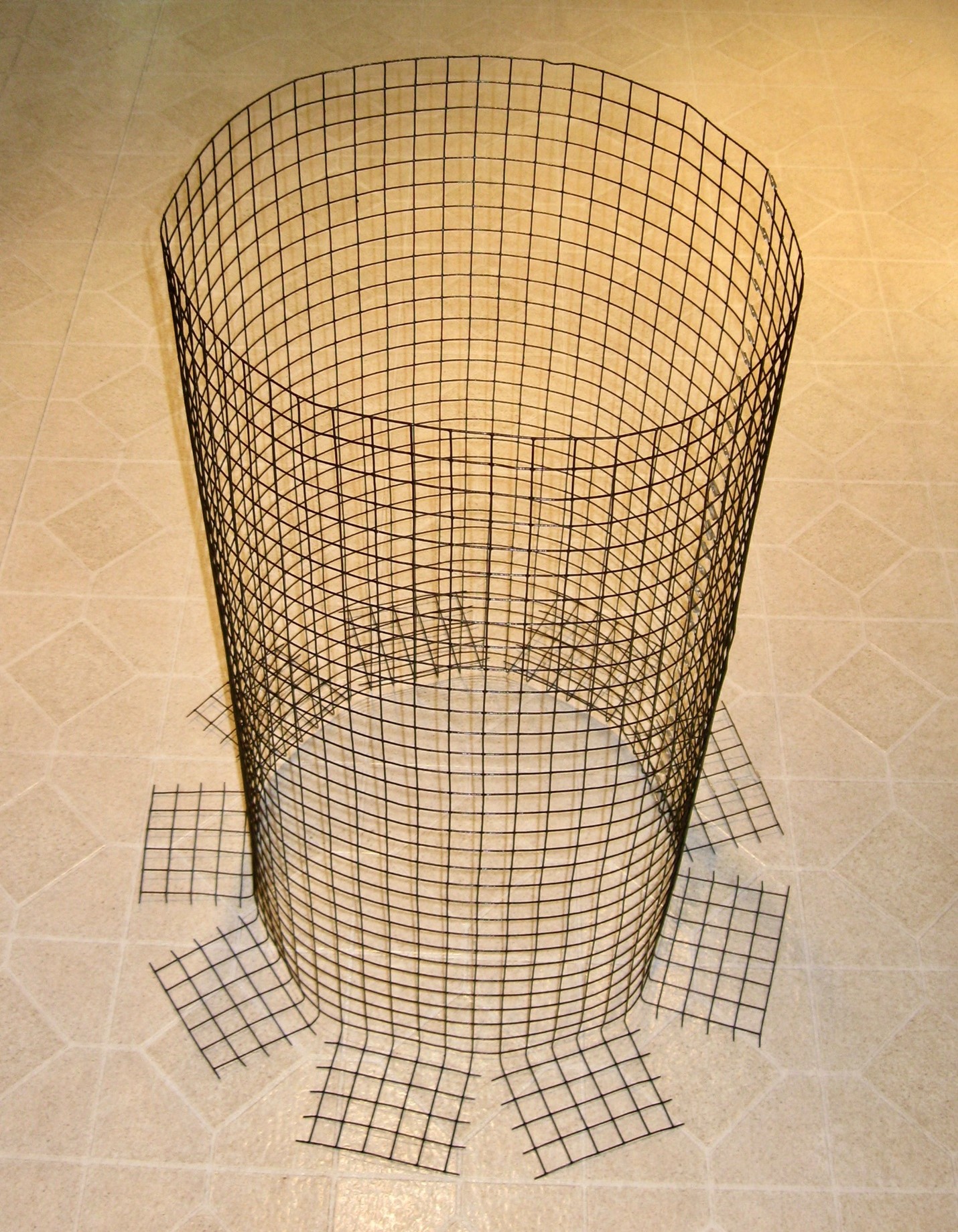 I bought a 100-ft roll of Critterfence, Black Steel, 1 inch Square Grid, 3 ft wide. I cut this roll into sections 56 inches long. From each section I formed a circular cylinder having height equal to 3 ft and diameter equal to 18 inches.