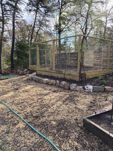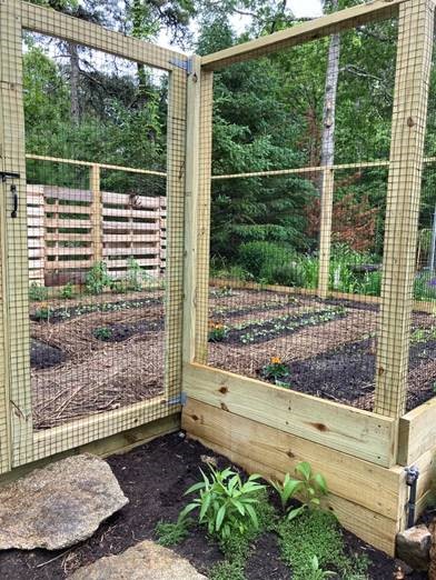Laura E from Brewster, MA used our 1" black grid fence rolls 5x100 1x1 https://www.critterfence.com/p... in their creation of garden protection on wood framing. "Hi, we purchased some fencing from you around 4/18 and at the time you asked us to share some photos of what we built. Here they are showing start to finish. My husband and son did all the work. They rented a machine to move all the compost we saved for 20 yrs and then purchased the lumber, built the box and walls, and then attached the screen and built a door. We are very happy with the fencing and with your professional advice and personal attention. You were a big help! The garden has provided respite and peace during these stressful times! As well as lots of food already!! Thank you. Laura and Scott"
