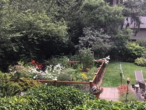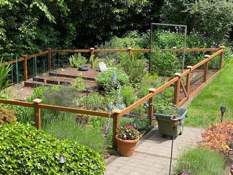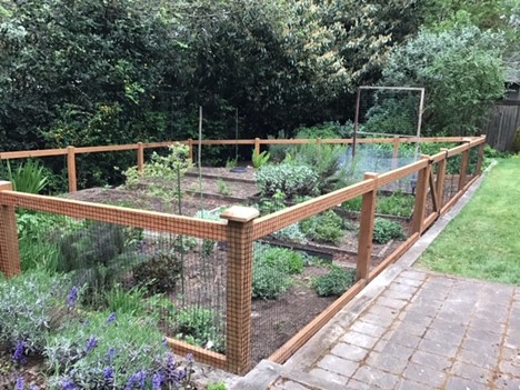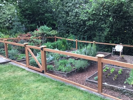Bette D from Bellevue, WA wrote, "We had a local fence company install a rabbit fence for us earlier this spring. We had all but given up on growing certain flowers and vegetables and decided to give your product a try. We have been so happy with the results – beautiful fence and best of all, it kept the critters out! See image for 3 thwarted bunnies! I even use it to keep my indoor cat entertained, hence the folding chair for me to keep her company."